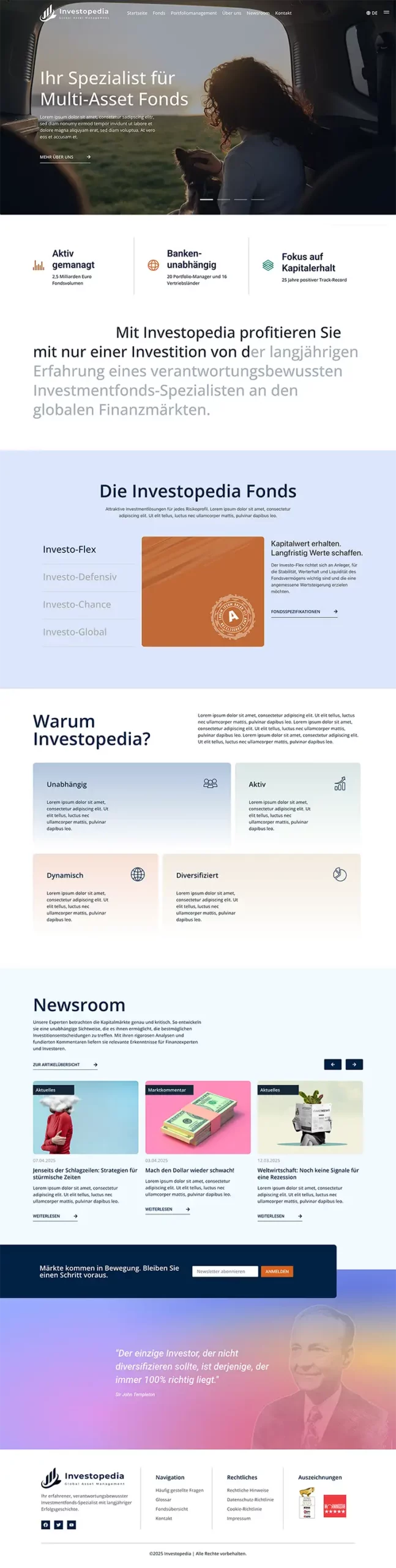 Ursprünglich wurde ein reines Figma-Design vorgeschlagen. Da der Kunde sich jedoch auch interaktive Mikroanimationen wünschte, empfahl ich einen praxisnäheren Ansatz: ein direkt umgesetztes, visuelles Design in Elementor, angereichert mit individuell programmierten Animationen wie Farbwechseln oder Texteinblendungen beim Scrollen. Besonderes Augenmerk lag auf der Balance zwischen Modernität und Seriosität, da es sich um einen renommierten Finanzdienstleister handelte. Das Design sollte leicht und interaktiv wirken, ohne dabei zu verspielt zu erscheinen. Einer der Entwürfe fungierte anschließend als Designvorlage, das die andere Agentur in ihrer eigenen Umgebung nachbaute.
